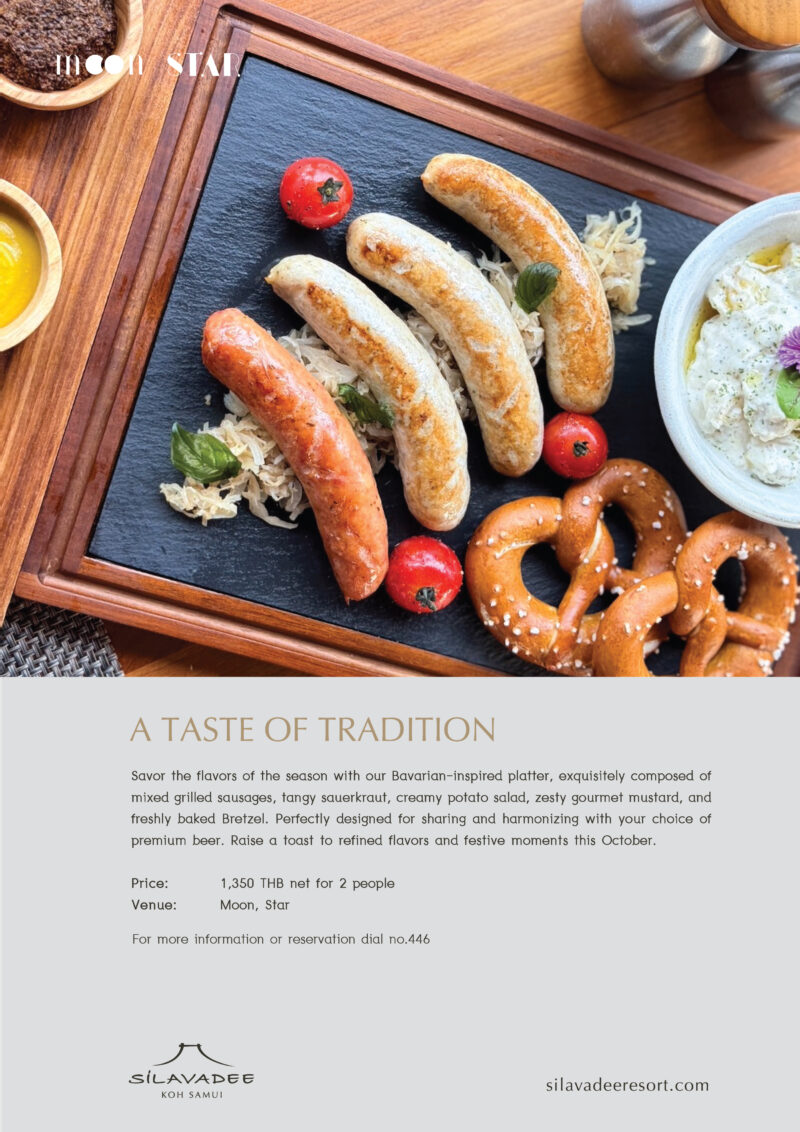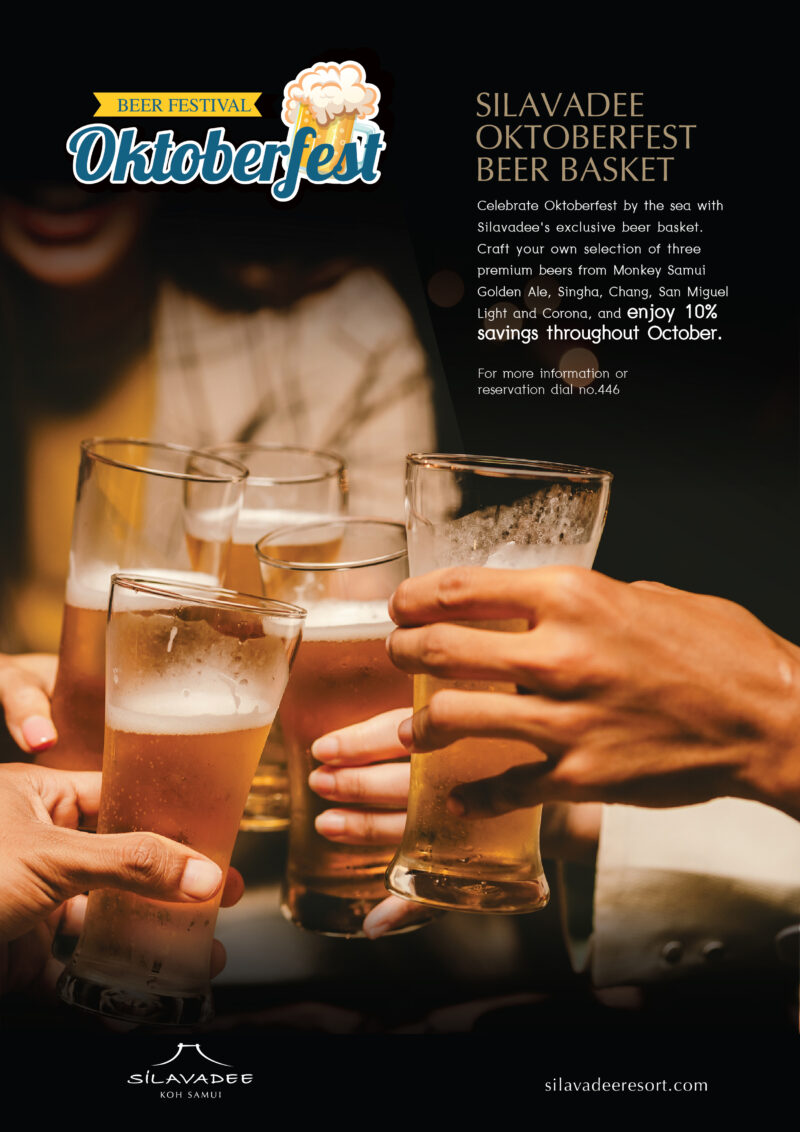 Celebrate Oktoberfest by the sea with Silavadee’s exclusive beer basket. Craft your own selection of three premium beers from Monkey Samui Golden Ale, Singha, Chang, San Miguel Light and Corona, and enjoy 10% savings throughout October.