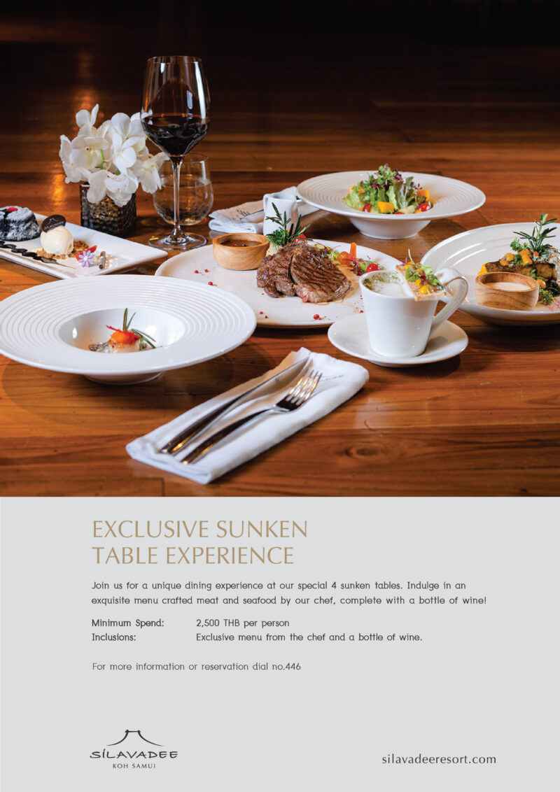 Join us for a unique dining experience at our special 4 sunken tables. Indulge in an exquisite menu crafted meat and seafood by our chef, complete with a bottle of wine!