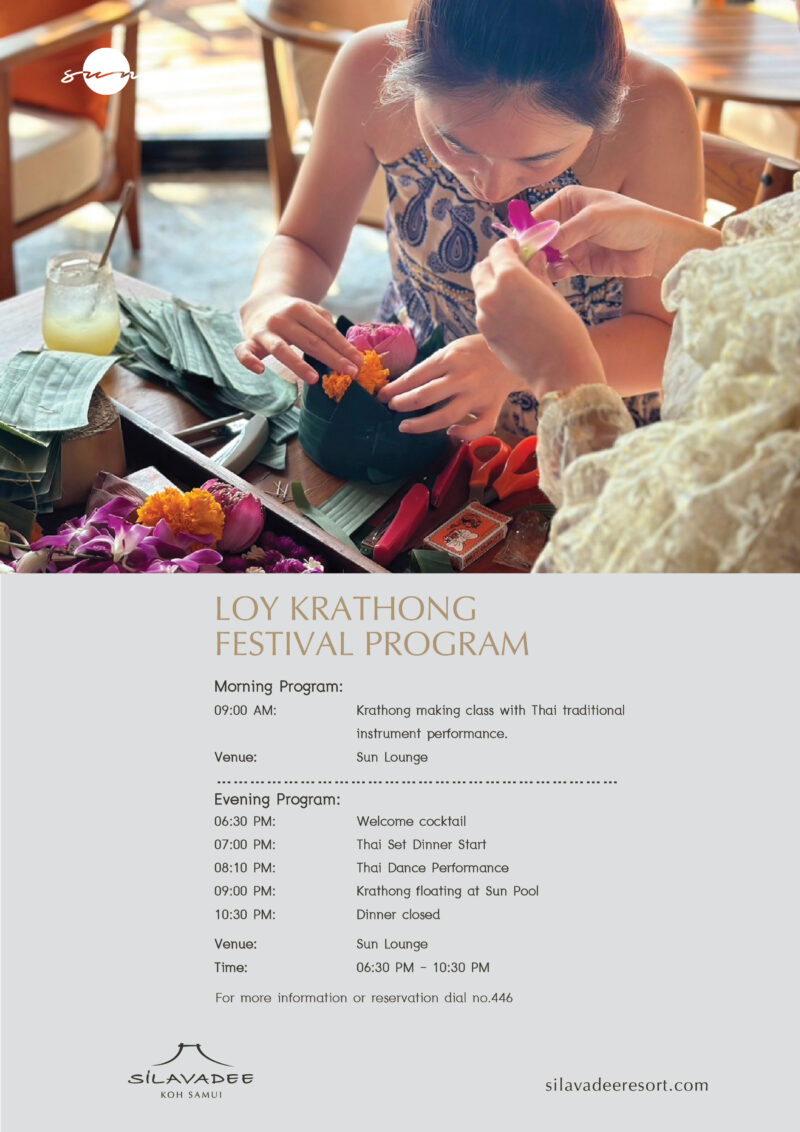 - 21:00 น. – ร่วมลอยกระทง ณ สระว่ายน้ำ Sun Pool